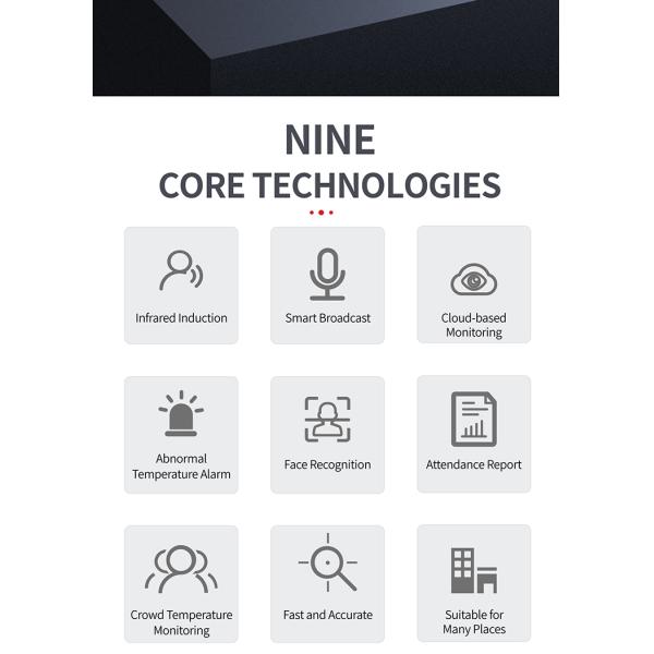 5 Cloud platform with temperature data, time attendance, access control, advertising video functions.